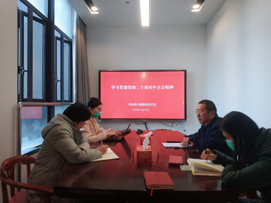 为深入学习贯彻党的二十届四中全会精神,博物馆党支部于11月26日在普陀校区博创楼206会议室开展了专题学习交流。博物馆党支部书记、常务副馆长夏祥伟主持学习交流,博物馆全体人员参加学习并开展研讨交流。