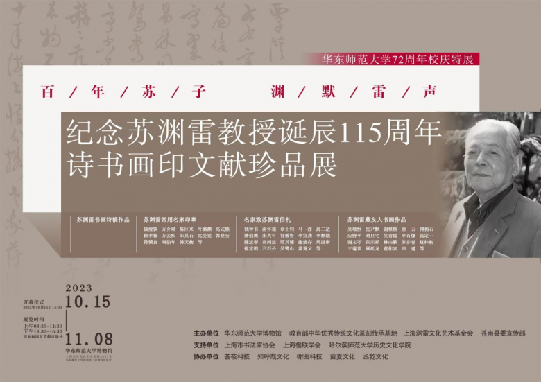 10月15日下午,作为华东师范大学72周年校庆特展“百年苏子·渊默雷声——纪念苏渊雷教授诞辰115周年诗书画印文献珍品展”,在华东师大博物馆展厅开幕。此次展览共展出与苏渊雷相关的信札、书画、印章等150多件,汇集了诸多20世纪学界泰斗、文化大儒、艺术名家的珍贵作品和手迹,其中不少属首次公开展出。